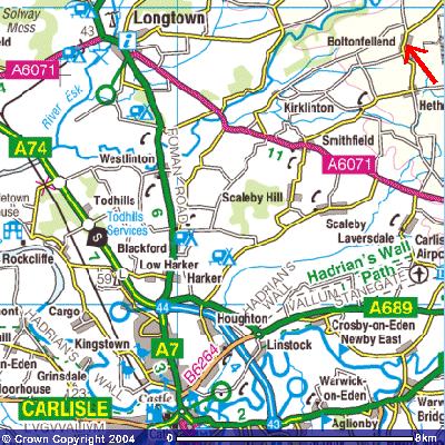 From the North Turn off the A74(M) to Longtown then after travelling most of the way through Longtown turn left to Brampton. After approx 3 miles at the the 'Roadhead 10' sign follow the guide above.